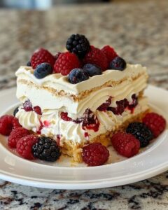 Oggi prepareremo una torta ghiacciata Ritz al limone e bacche, una deliziosa combinazione di frutti di bosco dolci, scorza di limone aspra e croccanti cracker Ritz. Questa ricetta si basa sulle famose torte ghiacciate che erano popolari all’inizio del XX secolo in America, quando i frigoriferi erano comuni nella maggior parte delle case. A causa della loro discreta bellezza e del cambiamento miracoloso che avviene quando vengono lasciate raffreddare in frigorifero durante la notte, le torte ghiacciate sono molto ricercate. D’estate, quando il caldo del forno non è proprio gradevole, o ogni volta che avete bisogno di un dolce creativo che non richieda troppa fatica, questa è la ricetta perfetta per voi.