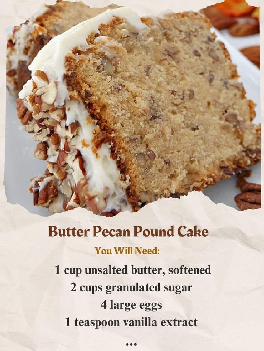 Ingredients: For the cake: 1 cup unsalted butter, softened 2 cups granulated sugar 4 large eggs 1 teaspoon vanilla extract 3 cups all-purpose flour 1 teaspoon baking powder 1/2 teaspoon baking soda 1/2 teaspoon salt 1 cup sour cream For the butter pecan filling: Continue Reading in next page