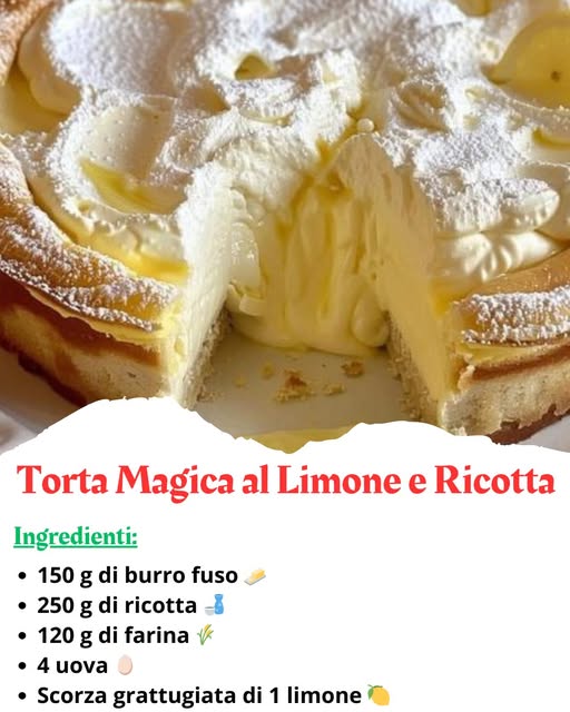 Torta Magica al Limone e Ricotta Ingredienti 150 g di burro fuso 250 g di ricotta 120 g di farina 4 uova Scorza grattugiata di 1 limone 150 g di zucchero 500 ml di latte tiepido 1 cucchiaino di estratto di vaniglia Zucchero a velo per decorare Preparazione vedere il seguito alla pagina successiva