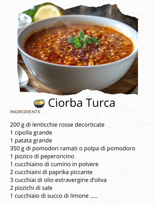 La ciorba turca è una zuppa tradizionale a base di lenticchie rosse decorticate, spezie aromatiche e verdure semplici. Diffusa in tutta la Turchia, è un piatto nutriente e confortante, ideale per ogni stagione. Grazie al suo sapore avvolgente e alla consistenza vellutata, è perfetta come antipasto o piatto principale.