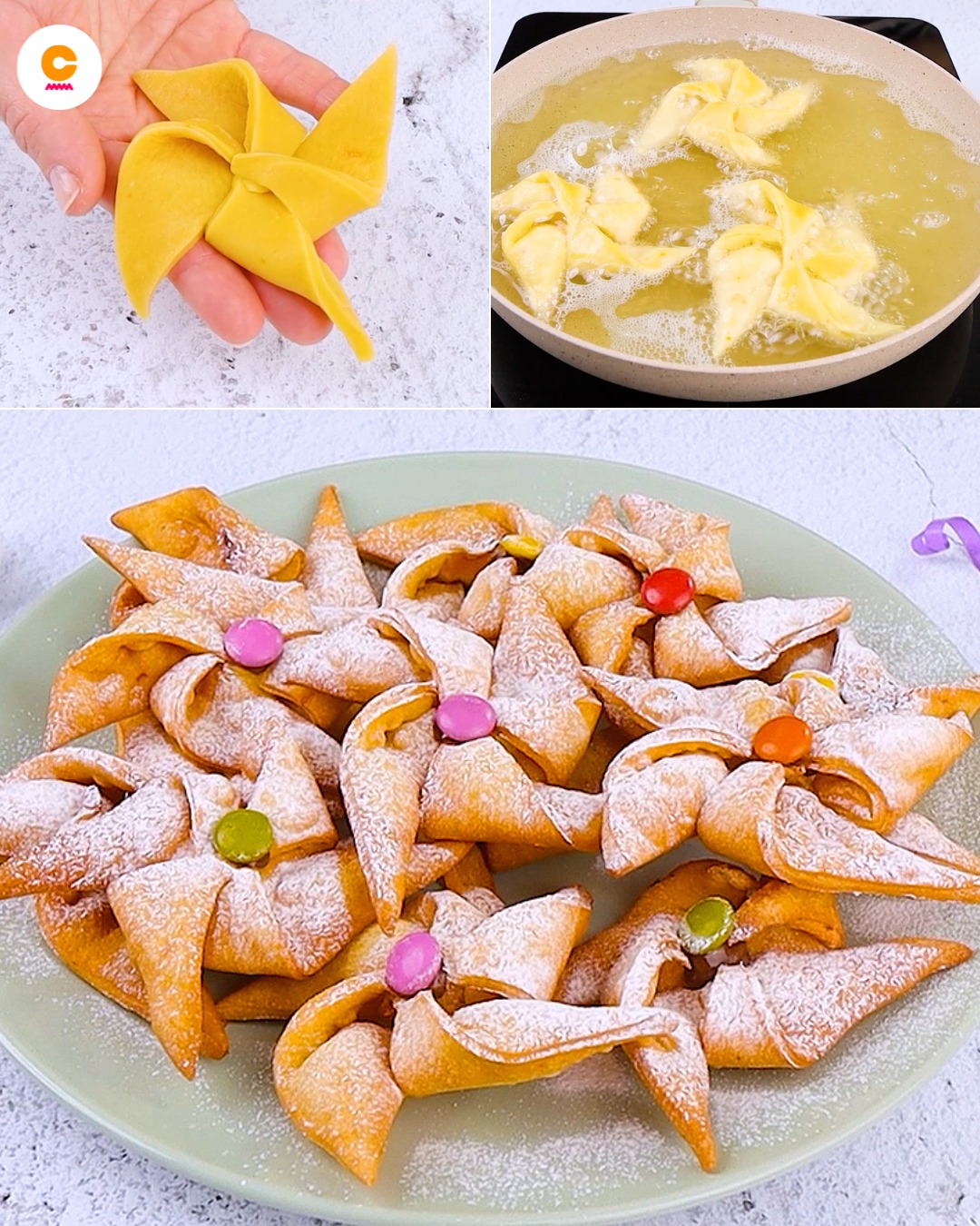 Le girandole di Carnevale sono dei dolcetti fritti sfiziosi e originali ideali da portare in tavola per la festa più allegra dell’anno insieme agli altri dolci di Carnevale. Per realizzarle abbiamo preparato un impasto simile a quello delle chiacchiere, a base di uova, farina, zucchero a velo, burro, liquore Strega e aromi che, una volta steso in uno strato sottile, viene suddiviso in tanti quadrati da 10 cm di lato, da incidere ai 4 angoli e ripiegare poi, a lembi alterni, verso il centro della sfoglia. In questo modo realizzeremo delle mini girandole, da friggere nell’olio ben caldo, da guarnire poi con crema di nocciole, confettini di cioccolato colorati e zucchero a velo. Ecco i passaggi per realizzarle.