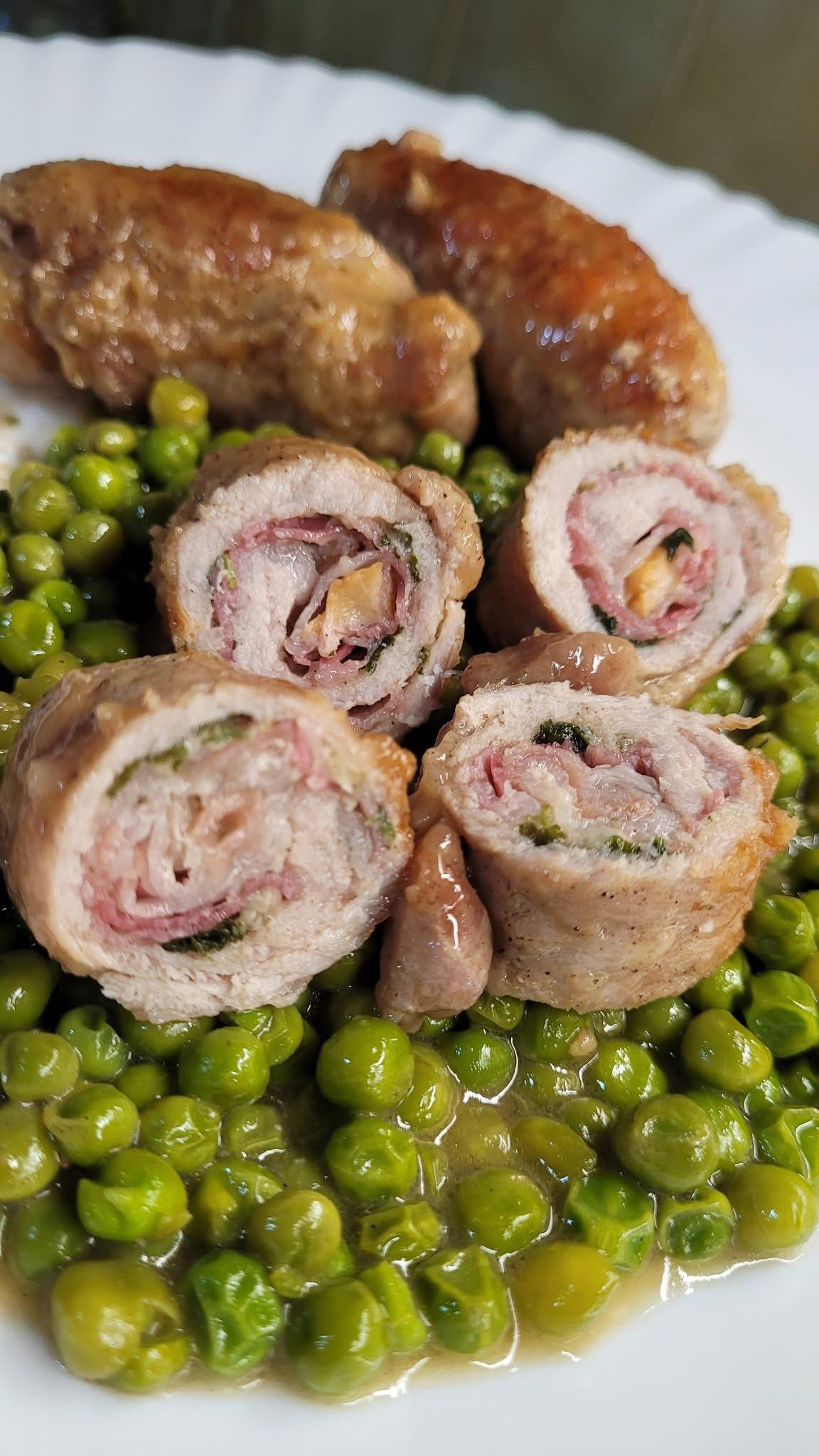 Questi involtini di carne, farciti con pancetta arrotolata, provola affumicata, aglio e prezzemolo, sono avvolti da una cremosità irresistibile e accompagnati da piselli teneri e profumati.