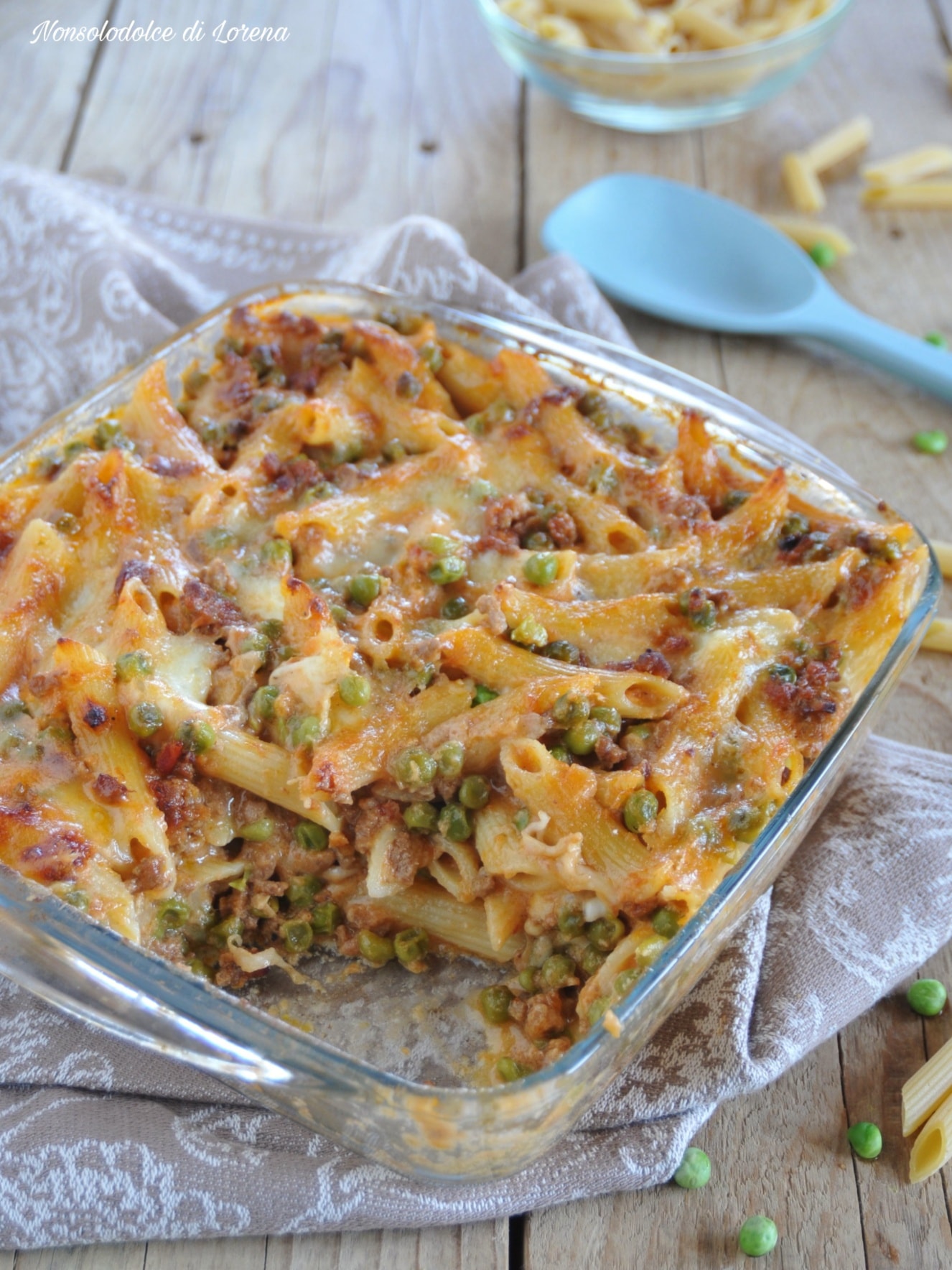 Ingredienti per la Pasta al forno con ragù e piselli: