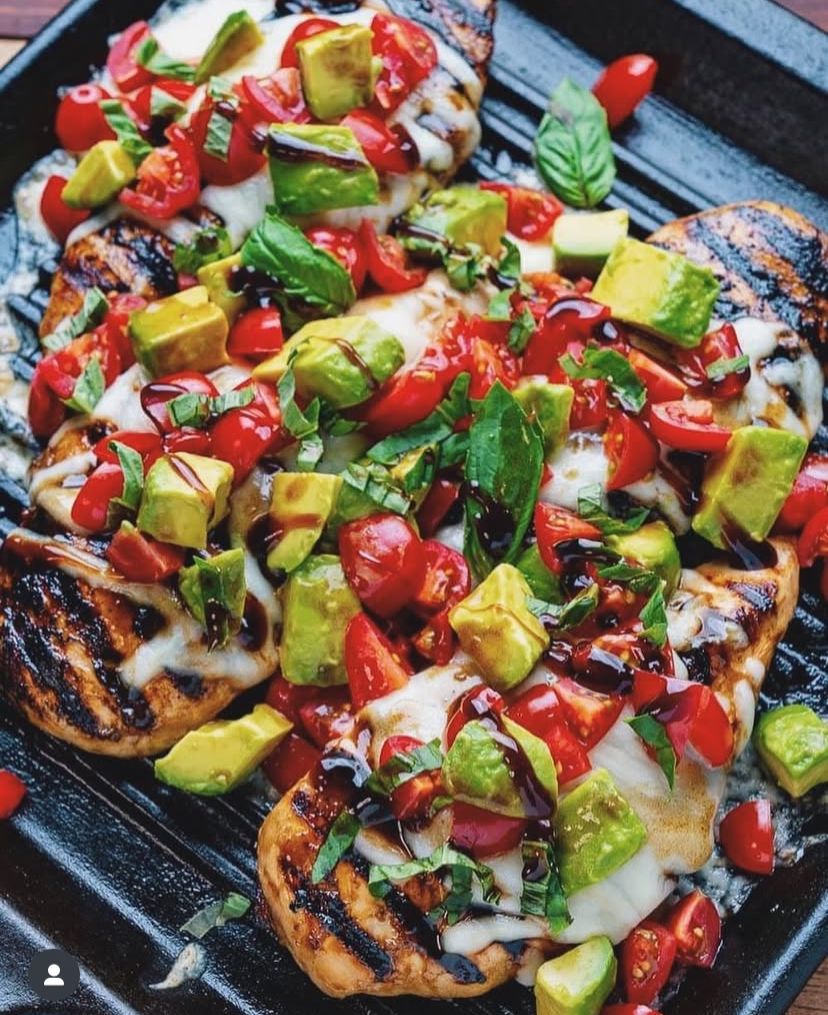 Un semplice pollo alla griglia marinato in una vinaigrette balsamica, condito con formaggio fuso, avocado, pomodoro e basilico!