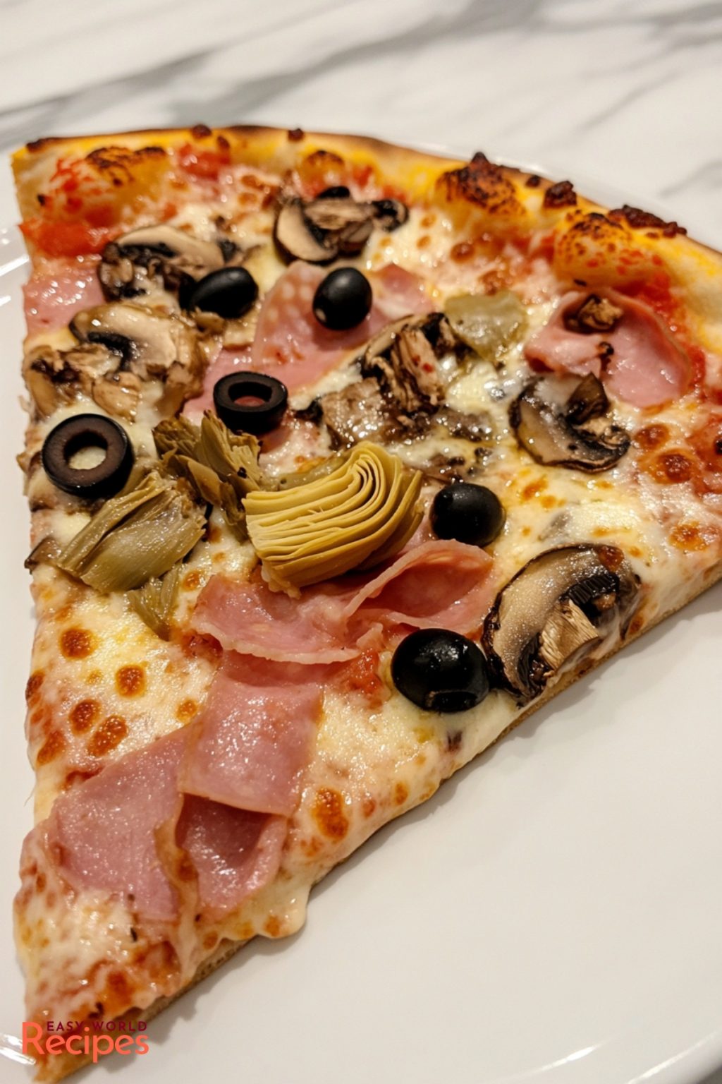 Questa pizza ha una crosta sottile e croccante ed è condita con salsa di pomodoro, mozzarella, prosciutto cotto, funghi, carciofi e olive. È una delle pizze italiane più amate ed è una deliziosa scelta per la pizza fatta in casa. Ha un perfetto equilibrio di sapori e consistenze. È semplice, deliziosa e veramente italiana!