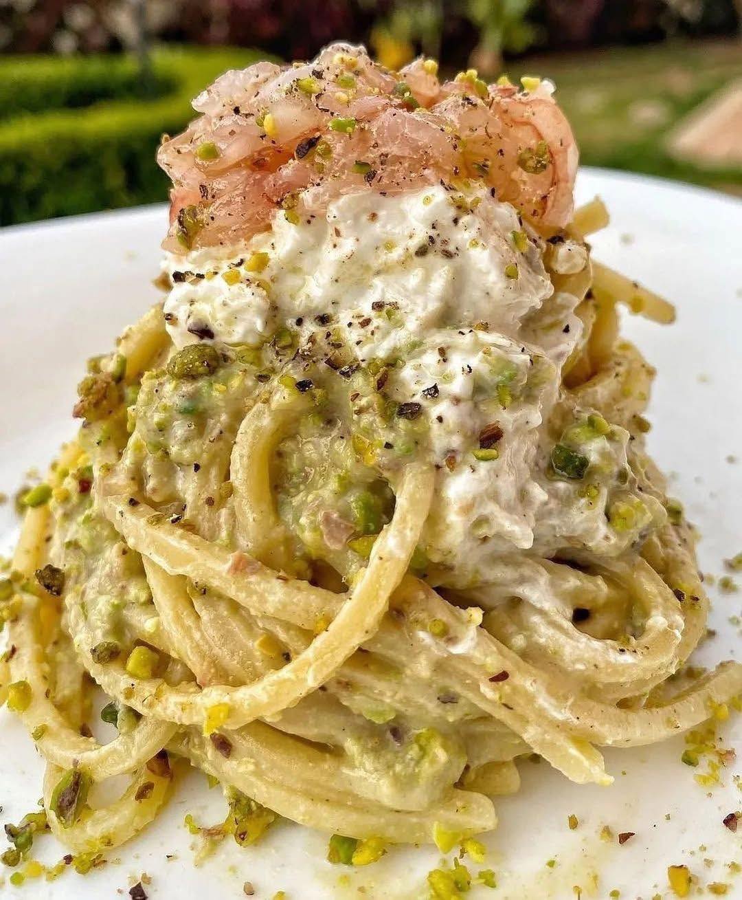 Tonnarello al Pistacchio con Burrata e Tartare di Gambero 🍤🌿